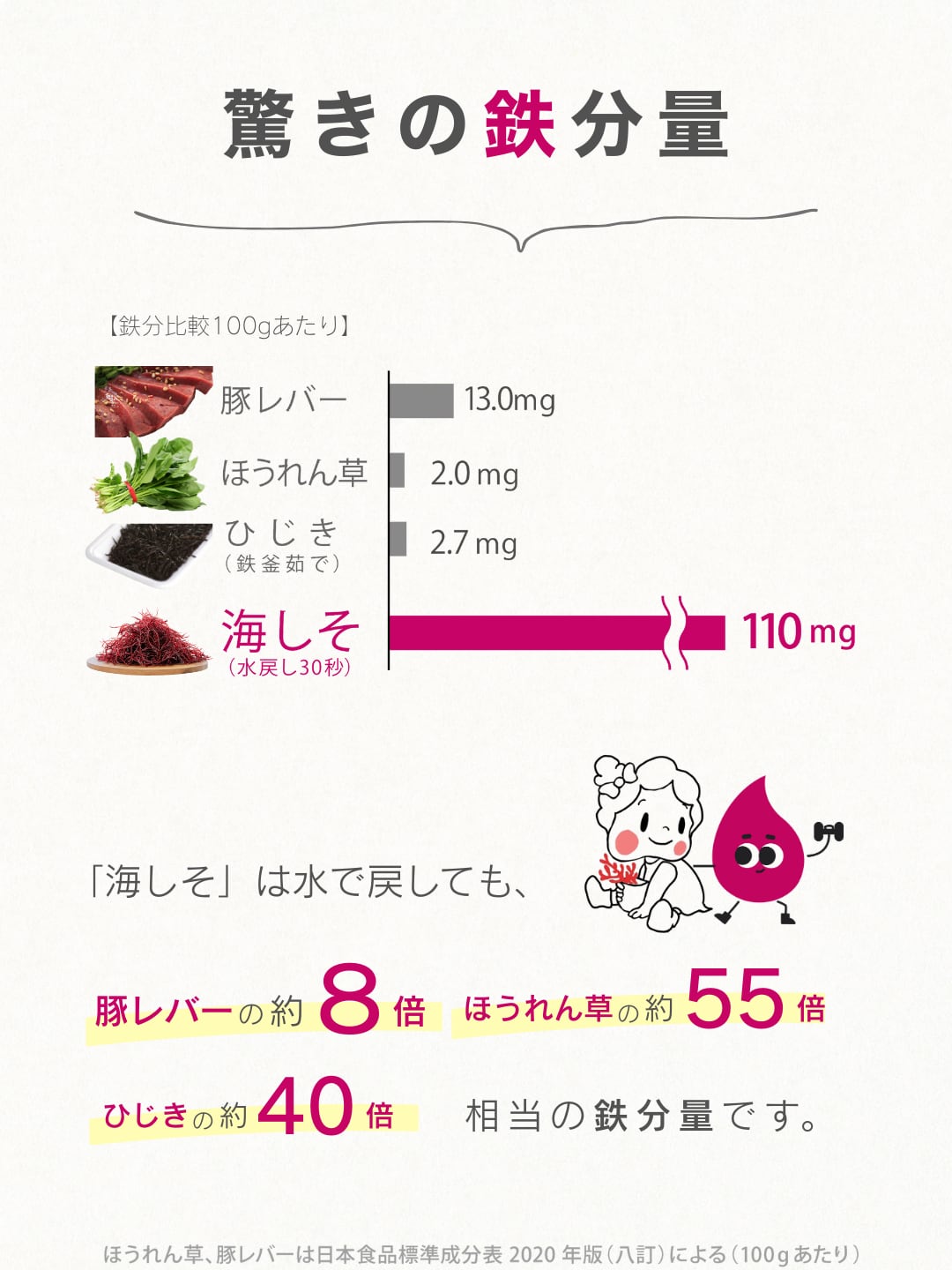 その鉄分量は、豚レバー・ほうれん草・ひじきを超えています。