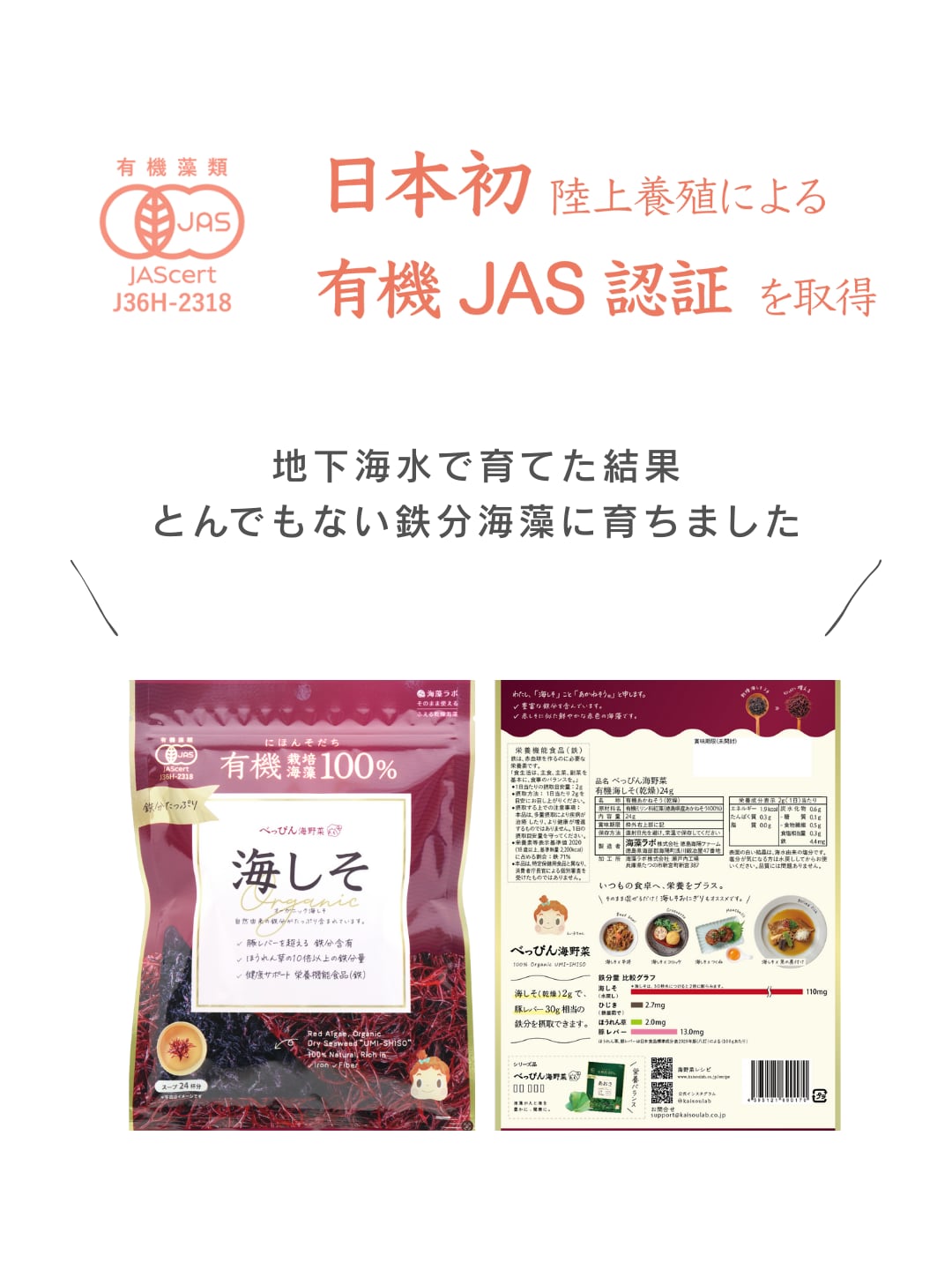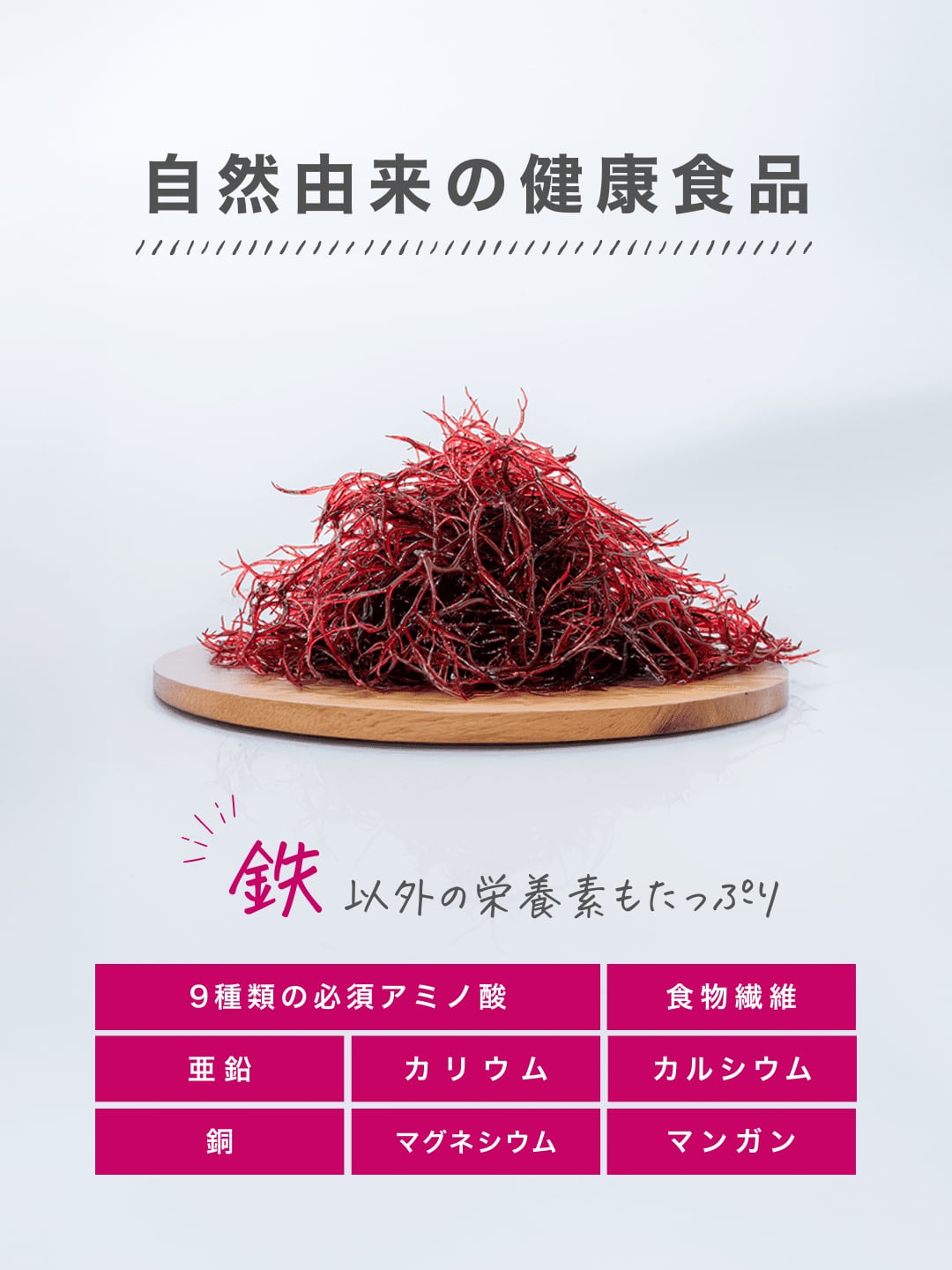 有機 海しそは、厳選されたオーガニックの海藻。鮮やかな色合いと、自然由来の豊富な鉄分が特長です。手軽に取り入れられる栄養機能食品として、多くの方にリピートいただいています。