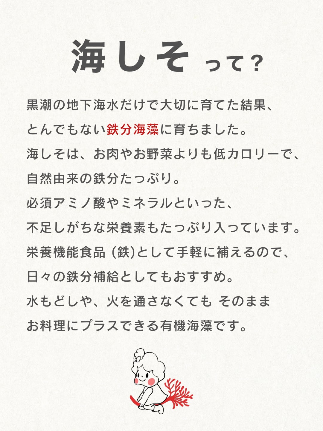 この海藻は、黒潮の地下海水から豊富な栄養素をたっぷり吸収し、ミネラルや食物繊維、必須アミノ酸がぎゅっと詰まっています。